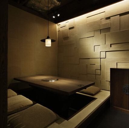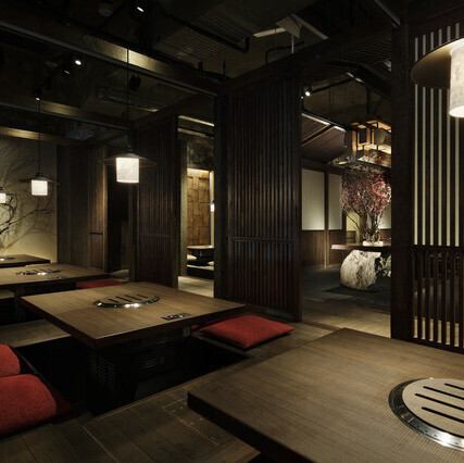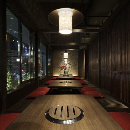 温かみのある照明と、和の趣を感じさせる落ち着いた雰囲気のお席です。足を伸ばしてくつろげる掘りごたつ席は、ご家族やご友人とのお食事に最適◎隣席との間隔もゆったりと確保されており、周りを気にせず会話と焼肉を心ゆくまでお楽しみいただけます。日常使いから接待やご宴会までご利用ください。